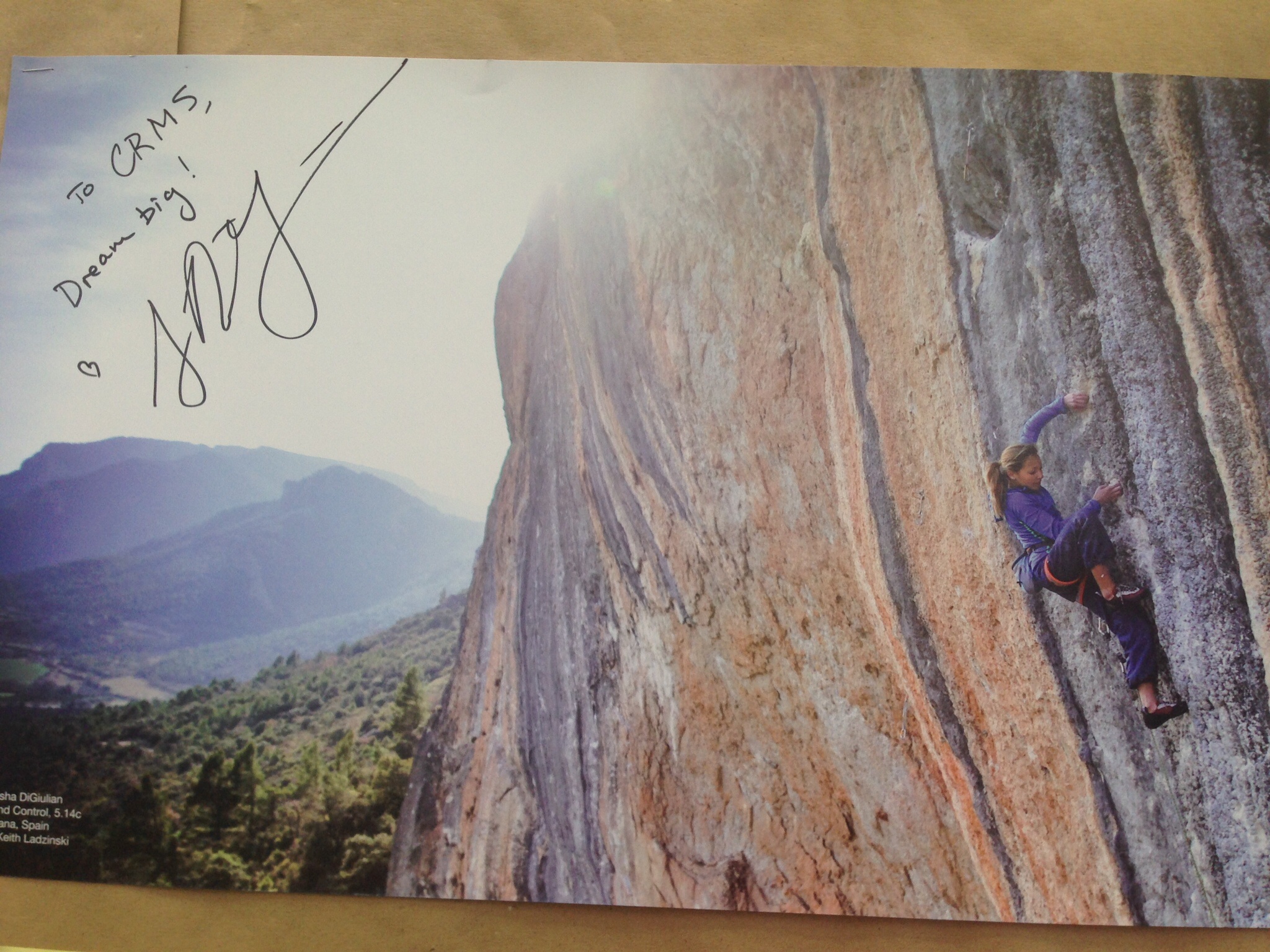 We begin our tour from the gym, where three of the four walls are climbing walls. We are in the Rocky Mountains and the encouragement to engage in mountain sports is constant. There is a poster on the one wall not occupied by climbing hand holds. It is a famous female rock climber. The poster is signed by her and on top of her name she wrote ” to CRMS dream big”. At this point I laugh. I can’t help but thinking of my high school Physical Ed. teachers, whom I have never seen wearing a pair of gym shoes in five long academic years. CRMS also offers a variety of other sports: soccer, tennis, horseback riding, yoga, kayaking, mountain biking, swimming and, of course, any type of skiing.